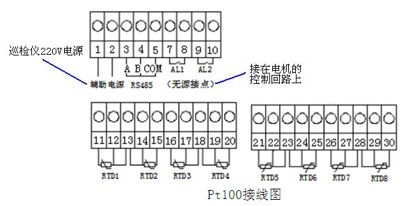 當(dāng)測量溫度高于巡檢儀設(shè)定的最高溫度時(shí),巡檢儀內(nèi)部觸點(diǎn)AL1、AL2動(dòng)作(通過設(shè)置),切斷電機(jī)控制回路以達(dá)到關(guān)斷電機(jī)電源,保護(hù)電機(jī)的目的。