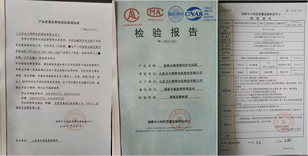 10月6號(hào),我們收到了國(guó)家中小電機(jī)質(zhì)量監(jiān)督檢驗(yàn)中心發(fā)來(lái)的《產(chǎn)品質(zhì)量監(jiān)督檢查結(jié)果通知單》和檢驗(yàn)報(bào)告,我們公司生產(chǎn)的這臺(tái)高效永磁變頻同步電動(dòng)機(jī)樣機(jī)經(jīng)過(guò)檢驗(yàn),所檢查項(xiàng)目符合GB/T755-2008旋轉(zhuǎn)電機(jī)定額和性能、GB30253-2013永磁同步電動(dòng)機(jī)能效限定值及能效等級(jí)、Q/1083SLJ018-2018TYP系列高效永磁同步電動(dòng)機(jī)、GB/T22670-2008變頻器供電三相籠型感應(yīng)電動(dòng)機(jī)試驗(yàn)方法等標(biāo)準(zhǔn),依據(jù)2019年永磁同步電動(dòng)機(jī)產(chǎn)品質(zhì)量國(guó)家監(jiān)督抽查方案,判定為合格。