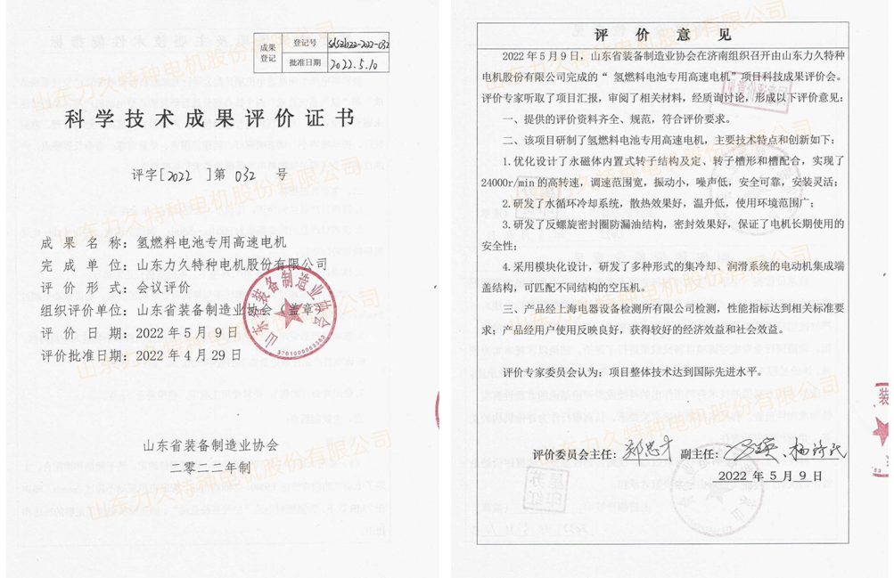 5月9日上午,山東省裝備制造業(yè)協(xié)會(huì)在濟(jì)南舉行了線上科技成果評價(jià)(鑒定)會(huì)議,力久電機(jī)研發(fā)的氫燃料電池專用高速電機(jī)順利通過評價(jià)(鑒定),成果產(chǎn)品整體技術(shù)達(dá)到國際先進(jìn)水平。