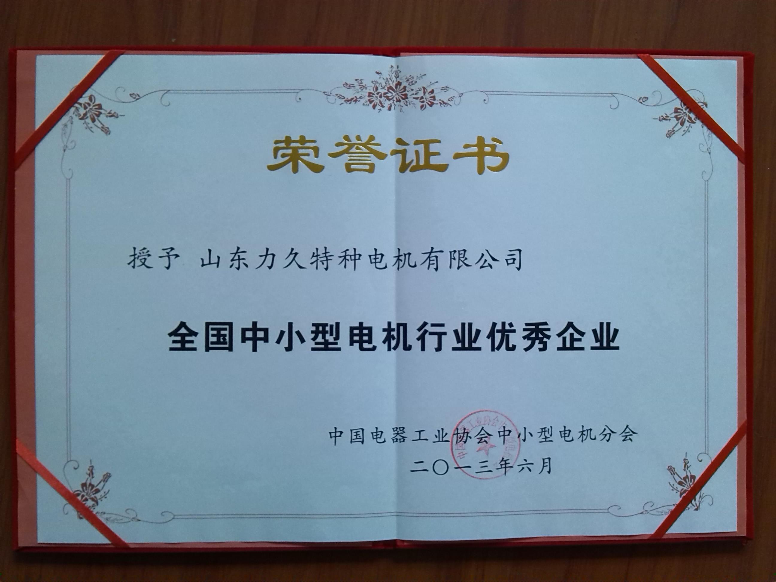 山東力久電機(jī)公司被授予“全國中小型電機(jī)行業(yè)優(yōu)秀企業(yè)”稱號