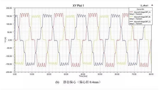 當(dāng)電機(jī)發(fā)生靜偏心故障時(shí),電機(jī)的對(duì)稱結(jié)構(gòu)遭到破壞,各個(gè)探測(cè)線圈下的氣隙長(zhǎng)度將變得各不相同,各個(gè)探測(cè)線圈下的氣隙磁通也將發(fā)生變化。靠近氣隙長(zhǎng)度減少的一側(cè)的探測(cè)線圈氣隙磁通將增大,而靠近氣隙長(zhǎng)度增大的一側(cè)的探測(cè)線圈氣隙磁通將減小。這必然導(dǎo)致各探測(cè)線圈中的感應(yīng)電壓幅值的不同,可以根據(jù)各線圈電壓幅值的大小,判斷電機(jī)是否發(fā)生靜偏心故障。