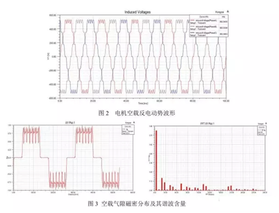 首先,有限元分析了該電機(jī)模型的空載特性,包括求解空載反電動(dòng)勢(shì),反電動(dòng)勢(shì)的諧波含量,氣隙磁場(chǎng)中的徑向磁密分布。永磁同步電機(jī)空載時(shí),由于電樞電流很小,電機(jī)內(nèi)僅有永磁體所建立的永磁磁場(chǎng)(主磁場(chǎng)和漏磁場(chǎng))??蛰d反電動(dòng)勢(shì)是永磁同步電機(jī)的一個(gè)非常重要的參數(shù),E0的大小對(duì)電機(jī)的動(dòng)、穩(wěn)態(tài)性能都有很大的影響,合理地設(shè)計(jì)電機(jī)的E0可以降低空載電流,提高功率因數(shù)和效率,降低電機(jī)溫升。經(jīng)分析,本次設(shè)計(jì)的永磁同步電機(jī)空載反電勢(shì)的幅值與外加電壓U的幅值的比值在0.95左右,證明該電機(jī)的設(shè)計(jì)是成功的,具有良好的空載特性。