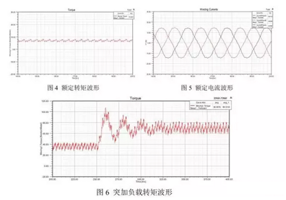 進(jìn)一步,對(duì)永磁同步電機(jī)額定負(fù)載下的穩(wěn)態(tài)特性進(jìn)行了仿真,求取了其輸出轉(zhuǎn)矩的波形以及定子繞組銅損、鐵芯損耗(包括鐵芯磁滯損耗與渦流損耗);另外求解分析了電機(jī)從半載到滿載的動(dòng)態(tài)過(guò)程,證明了電機(jī)具有較好的帶載能力和動(dòng)態(tài)性能。為接下來(lái)進(jìn)一步的仿真分析建立了基礎(chǔ)。