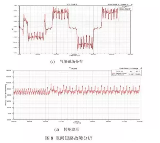 結(jié)果表明,在故障初期,也就是短路電阻較大時(shí),短路電流if較小,故障現(xiàn)象不明顯,短路處的發(fā)熱不大。隨著故障的發(fā)展,短路電阻迅速減小,短路電流增大,短路處的發(fā)熱量增大,使得絕緣迅速失效,故障進(jìn)一步加劇,最終導(dǎo)致繞組完全短路,燒損。因此,短路電流應(yīng)是評(píng)價(jià)電機(jī)故障程度的一個(gè)重要指標(biāo)。同時(shí),通過(guò)對(duì)輸出轉(zhuǎn)矩的分析,匝間短路故障導(dǎo)致了轉(zhuǎn)矩波動(dòng)的增加,這表明了氣隙磁場(chǎng)發(fā)生了畸變。