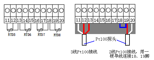 根據(jù)左側(cè)接線圖接三線制和二線制Pt100,白線為Pt100正,紅線為負(fù),藍(lán)線為二線制Pt100添加的導(dǎo)線。